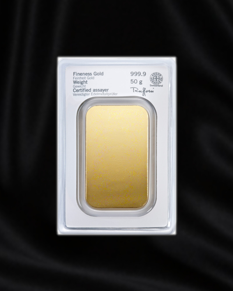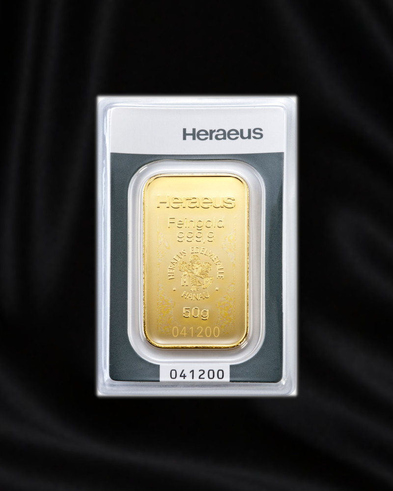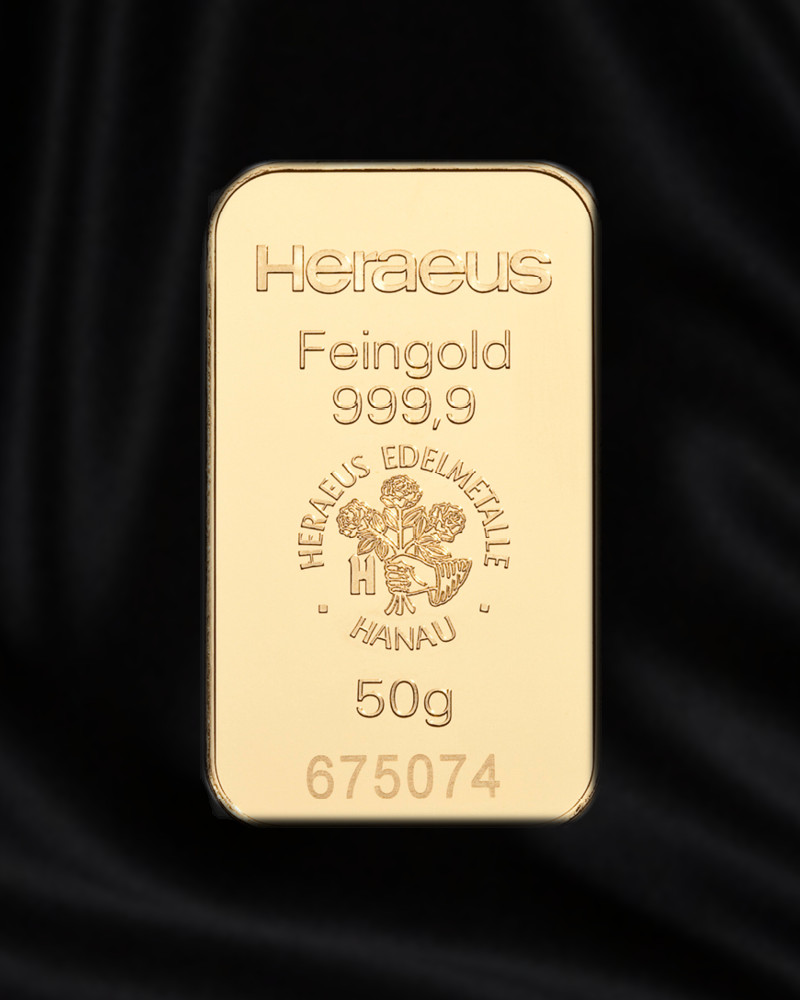 Lingote de oro fino de inversión de 50 gr de la casa Heraeus.