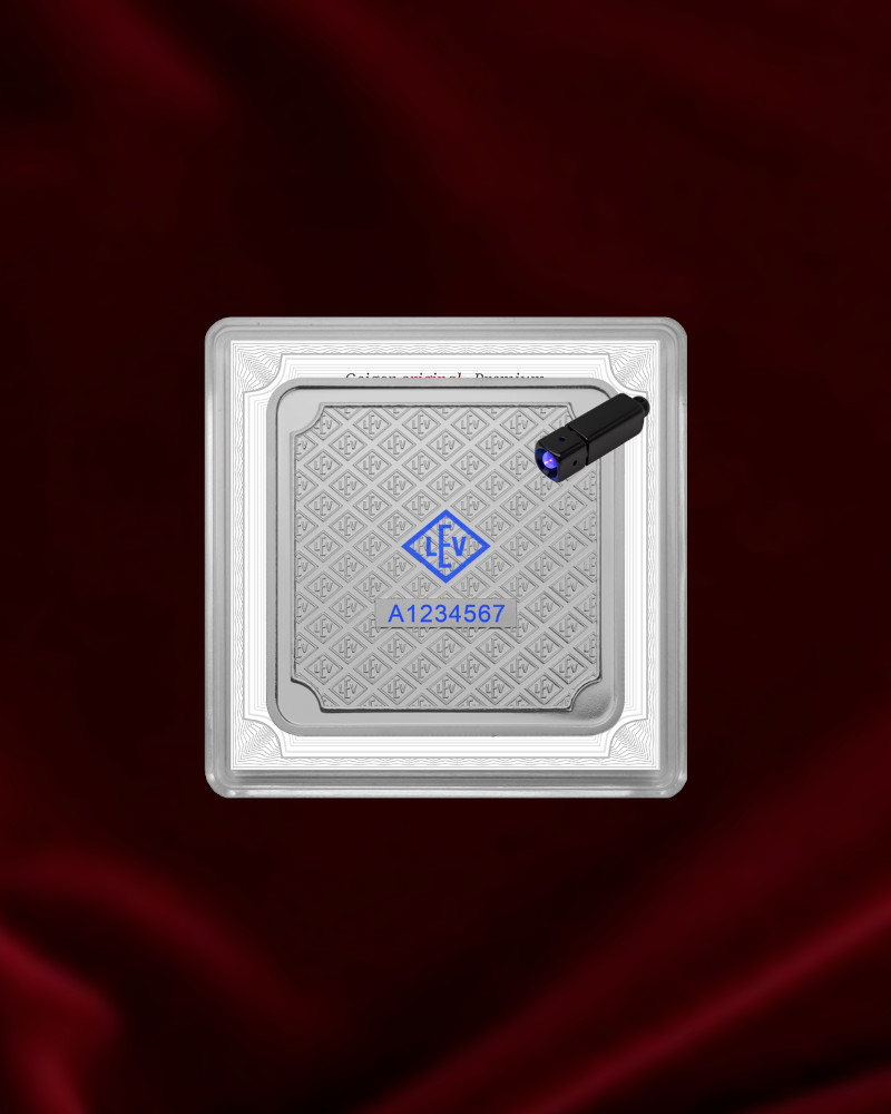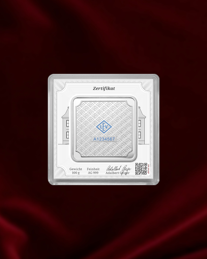 En este caso, el lingote de 100 gr por su precio moderado, es ideal para regalos y para pequeñas inversiones. Para inversiones más grandes, puede también adquirirse en «monster box» de 100 unidades. En ese caso, póngase en contacto con nosotros para gestionarlo. Cualquiera de los lingotes de plata Geiger en cápsula son excelentes como inversión y como regalo especial. Su elegante diseño encapsulado lo convierte en una pieza única que mostrar y conservar. Las barras de plata dentro de la cápsula están selladas con papel de aluminio y esta solo puede abrirse por rotura.No intenten abrirla. En el interior se puede encontrar un certificado de autenticidad de diseño elegante. Como medida de seguridad adicional y autenticidad, el reverso de los lingotes tiene un revestimiento azul con un número de serie individual y otra seña de identidad centrada. Este revestimiento azul tiene la característica especial de brillar bajo iluminación UV.