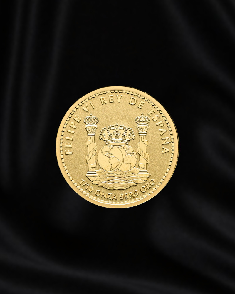 En el centro superior de la pieza, dentro de un círculo, en forma de imagen latente cuádruple, aparecen la marca de Ceca, una estrella de cinco puntas, el símbolo gráfico del euro y la silueta del columnario. En la parte superior, en sentido circular y en mayúsculas, aparece la leyenda FELIPE VI REY DE ESPAÑA. En la parte inferior de la moneda, en sentido circular, la leyenda 1 Oz 999,9 ORO. Rodea los motivos y leyendas una gráfila de piñones.