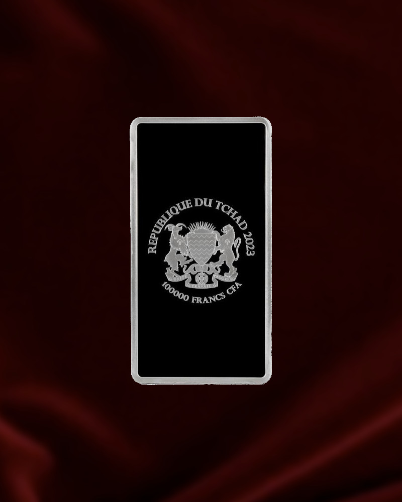 A pesar de su aspecto de lingote, se trata de una moneda de inversión de plata fina (999,9), con licencia de República del Chad, que se ofrece envasado al vacío en una preciosa caja azul. Estas monedas tienen número de serie, lo que hace que cada pieza sea única.Moneda de plata Diosa Europa