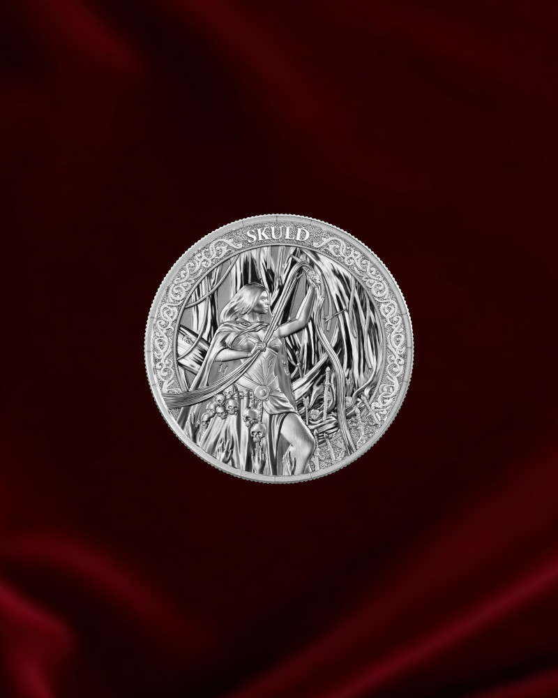 Serie de monedas de Plata de inversión de Germania Mint, 1 oz, pureza 999,9 del año 2026: Verdanda, el pasado. Las Nornas son antiguas deidades videntes nacidas de la estirpe de los gigantes según la mitología antigua nórdica, son guardianas del destino y del fluir del tiempo. A la sombra de las profundas raíces de Yggdrasil, el Árbol de la Vida, estas figuras eternas tejen y preservan el hilo del devenir de dioses y mortales por igual. Las principales son tres, conocidas con los nombres de Urðr (o Urd, «lo que ha ocurrido»), Verðandi (o Verdandi, «lo que está ocurriendo») y Skuld (o Skulu, «lo que debe ocurrir»). Urd, Verdandi y Skuld representan el Pasado, el Presente y el Futuro: tres hermanas inseparables, unidas por un vínculo indisoluble con el Árbol del Mundo. Sus nombres no son simples designaciones, sino la propia cadencia del tiempo, el ritmo que rige toda existencia. SLULD está asociado en nórdico antiguo (así como en los idiomas escandinavos modernos) a «deuda, falta, culpa, o responsabilidad«. Etimológicamente la palabra deriva de skola en islandés/nórdico antiguo, «necesidad, ser necesario». Ella también desempeñaba un trabajo de valquiria, cabalgando en los campos de batalla mientras decidía sobre las vidas de los combatientes y decidiendo la suerte que llevaría a la victoria.Se han emitido 5000 unidades para todo el mundo.